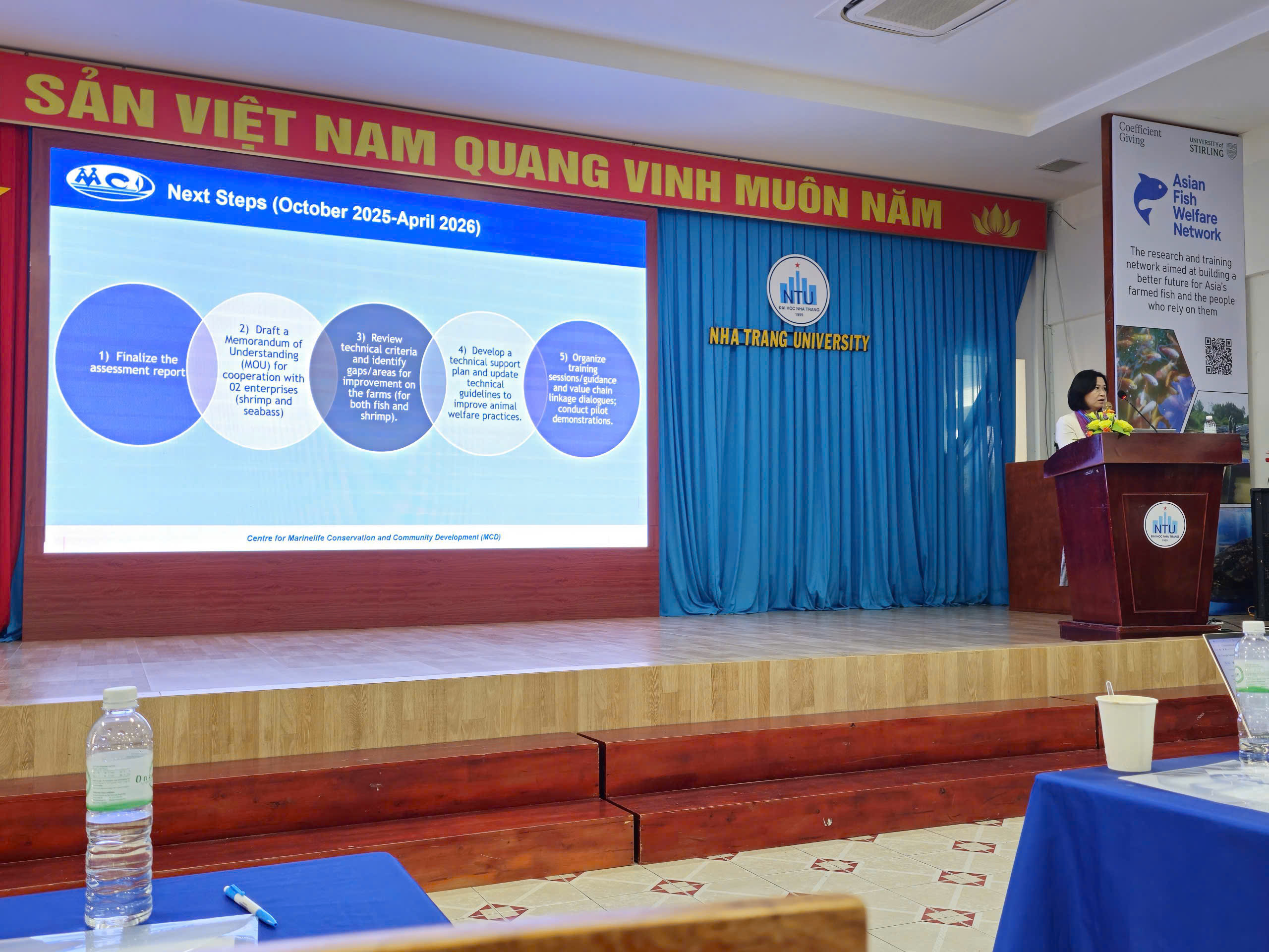 On November 27, 2025, in Nha Trang, Khanh Hoa province, representative from the Centre for Marinelife Conservation and Community Development (MCD) attended the workshop “Asian Fish Welfare Network in Nha Trang, Vietnam”. The event was organized by the Institute of Aquaculture – Stirling University, in collaboration with the Institute of Aquaculture – Nha Trang University. The workshop aimed to strengthen capacity, share experiences, and exchange best practices for enhancing the welfare of farmed fish in Vietnam and across Asia. It also provided a valuable platform for participants to exchange information, build professional networks, and define the roles of key stakeholders in promoting sustainable aquaculture through improved animal welfare standards.