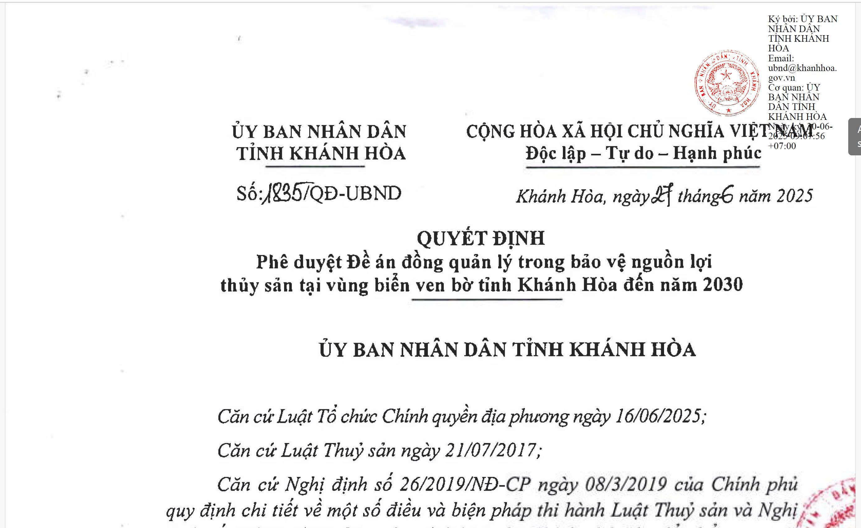 The Khanh Hoa provincial People’s Committee approved the “Provincial Co-management Plan for fisheries resource protection in coastal waters” per Decision No. 1835/QD-UBND dated June 27, 2025.
