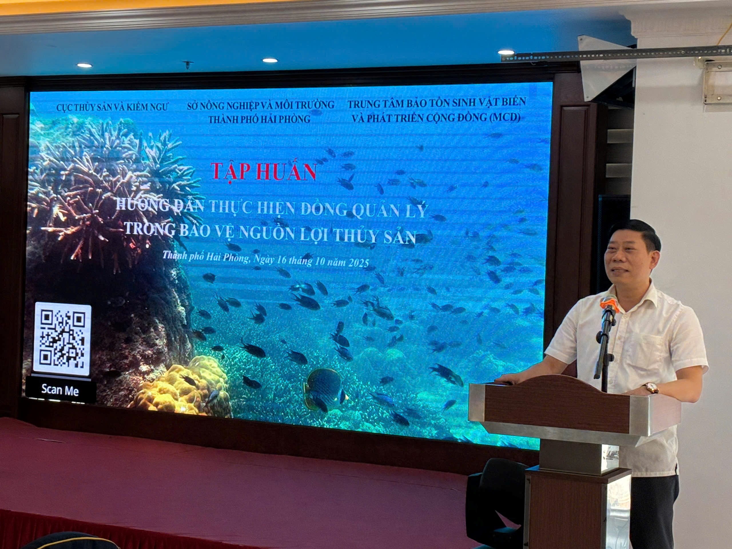Ngày 16 tháng 10 năm 2025 tại Thành phố Hải Phòng, Cục Thủy sản & Kiểm ngư đã phối hợp với Sở Nông nghiệp và Môi trường thành phố Hải Phòng cùng Trung tâm Bảo tồn Sinh vật biển và Phát triển Cộng đồng (MCD) đã tổ chức hoạt động “Tập huấn hướng dẫn thực hiện đồng quản lý trong bảo vệ nguồn lợi thủy sản” khu vực miền Bắc. Đây là hoạt động tiếp theo trong chuỗi tập huấn với mục tiêu tăng cường nhận thức, kiến thức và năng lực cho cán bộ các cơ quan liên quan và cộng đồng ở các địa phương về đồng quản lý trong bảo vệ nguồn lợi thủy sản.